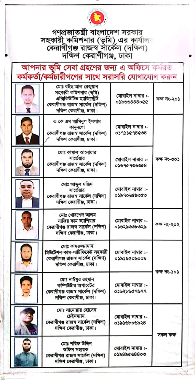 ১। কেরাণীগঞ্জ রাজস্ব সার্কেল (দক্ষিণ), কাচারীপাড়া, শুভাঢ্যা, দক্ষিণ কেরাণীগঞ্জ, ঢাকা